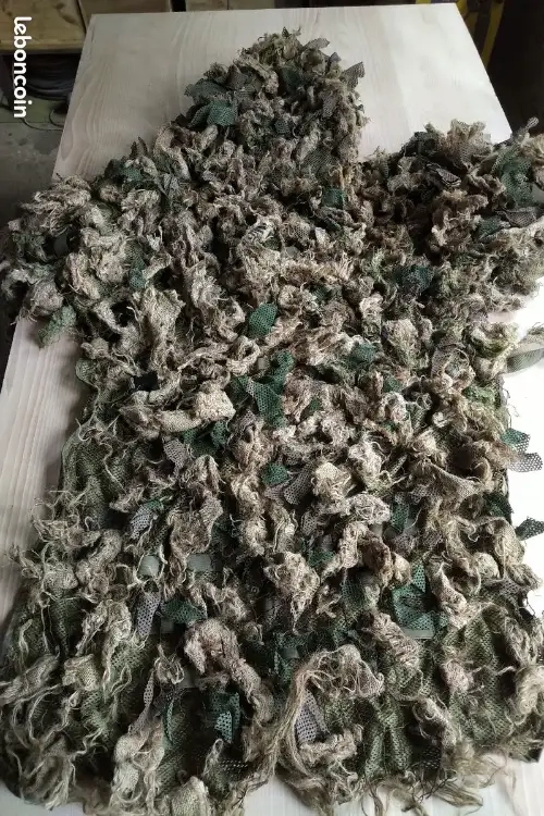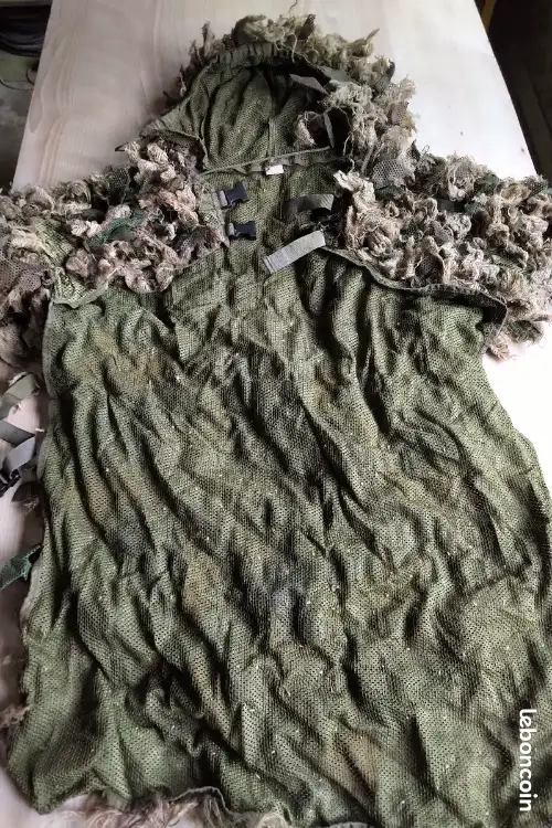 Vends ghillie suit fait maison, à partir d'une cape MFH. Taille unique, avec deux clips rapides sur le torse et un troisième au niveau de la ceinture. Capuche détachable.
