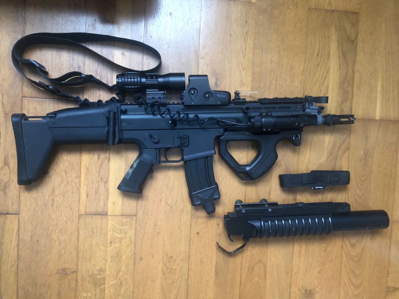 SCAR FULL Metal avec lance grenade, magnifier , red dot , 4 chargeurs , poignée CQB , sangle 1 point