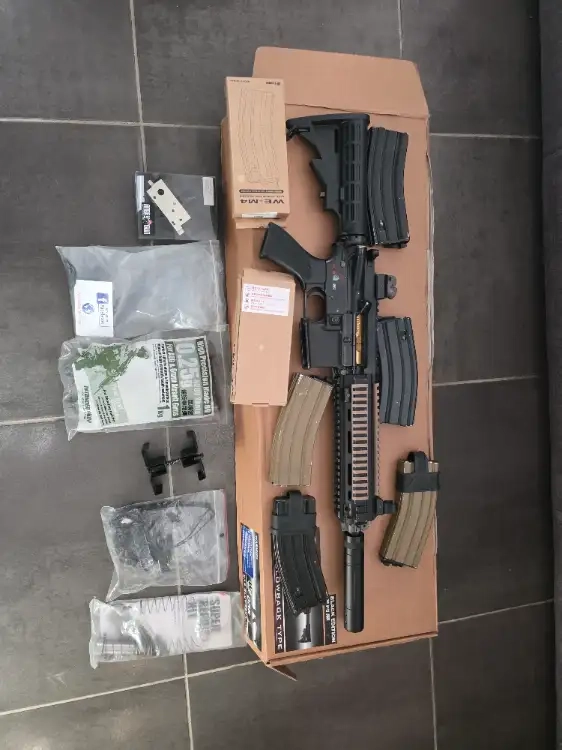 Bonjour je vend un hk416 we full upgrade ra tech avec 7 chargeurs kit super recule et detente angry gun toute les pieces origine fournis avec la replique fonctionne tres bien pour plus d’info me contacte par message