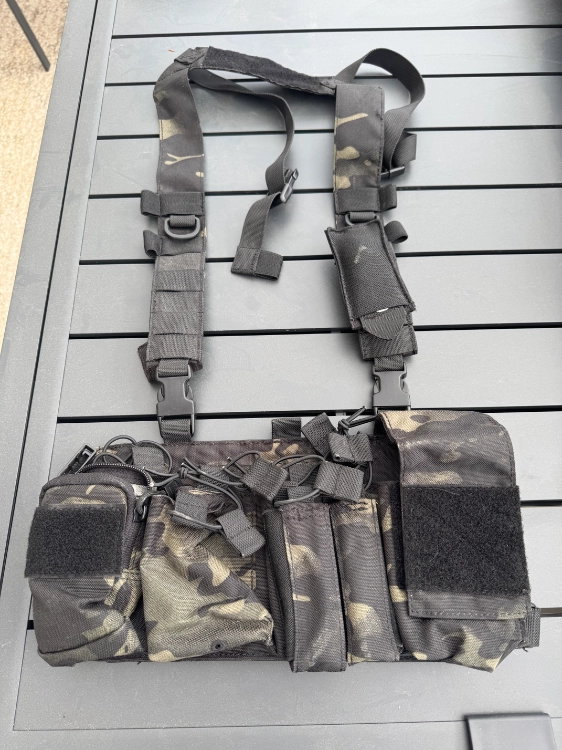 Bonjour, je vends un gilet tactique airsoft avec foulard rouge. Dessus plusieurs portes chargeurs AR et pistolet.