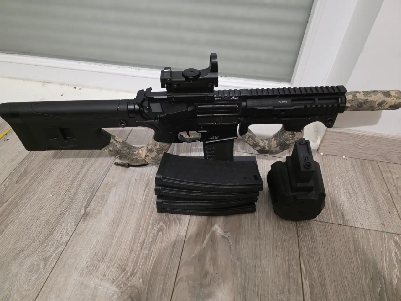 Je met en vente ma CQR de chez ics convertie en hpa avec un kythera, raccord us, bloc hop up maxx model, joint maple leaf , vendu avec 4 chargeur midcap 140bbs et 1 drum de 1200bbs électrique