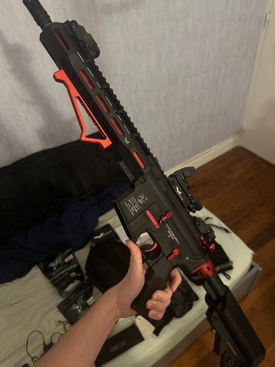 -Réplique M4 colt Hornet red fox aeg full métal avec red dot rajouter + poigne ergonomique rouge.