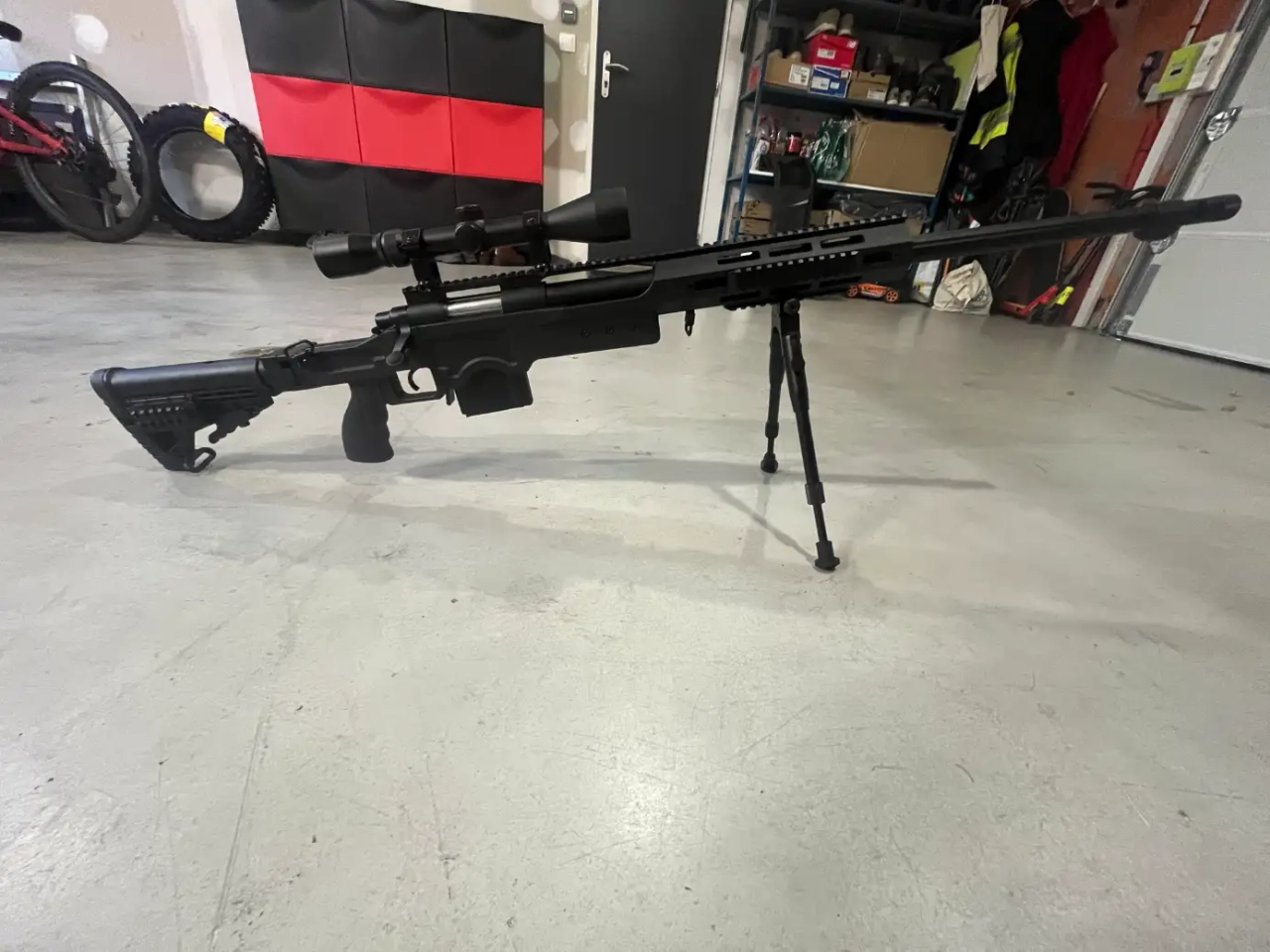 Je vends mon Well MB4412C (sniper airsoft) — utilisé seulement 2 fois, je ne m’en sers plus. Réplique en excellent état, puissance : 1,6 J. Vendu avec bipied compatible et 1000 billes 0,40 g. Livrée avec lunette 3‑9×40 et montures.