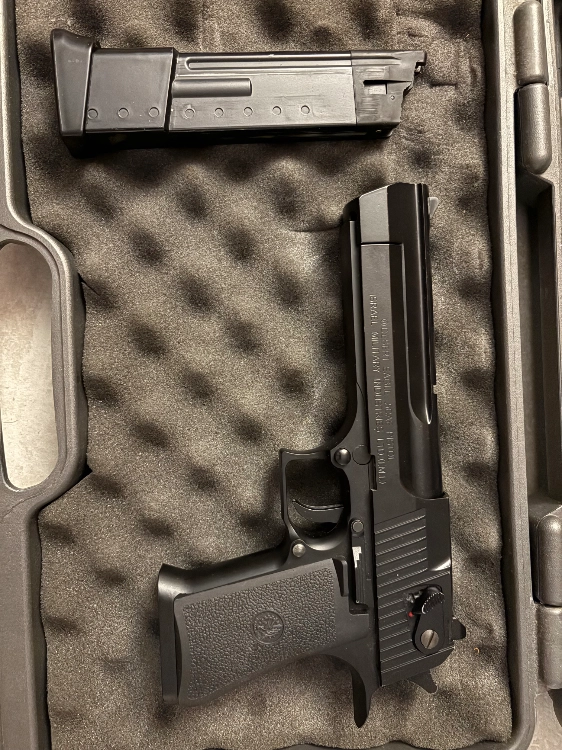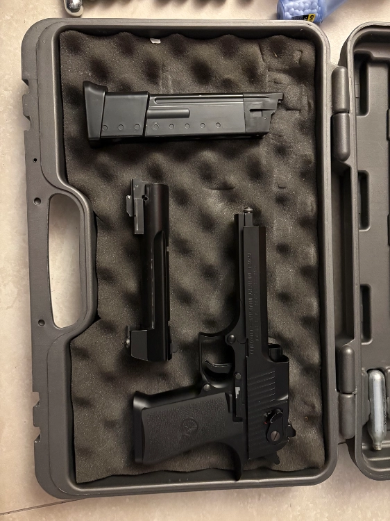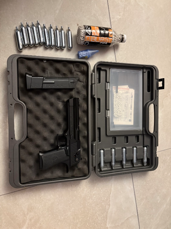 Vente d’un pistolet airsoft CO2 Desert Eagle de chez cybergun. Il fonctionne bien et n’a pas été beaucoup utilisé. Je le vends avec bouteille de bille et cartouches de CO2 en plus. Il dispose d’un chargeur long permettant d’enchaîner les tirs.