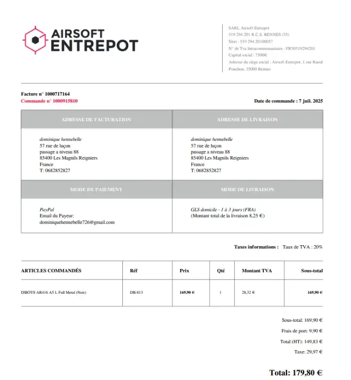 vend D|BOYS AR416 A5 L Full Metal (Noir),acheter le 7 juillet 2025,avec facture