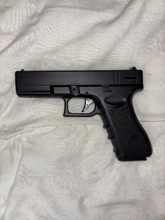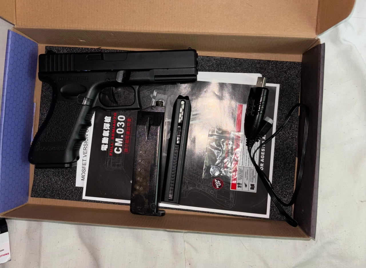 AIRSOFT Arme de poing, réplique d’un G18C de la marque CYMA en édition MOSFET, jamais utilisé, 0,5 joules, la réplique est faite en polymère très résistant, contient un chargeur de 29 billes maximum, avec 2 mode de tirs : semi automatique et automatique avec une sécurité.
