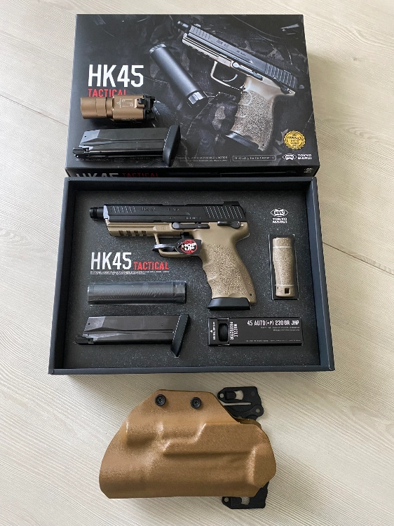 Lot complet prêt à jouer HK45 Tactical Tan Tokyo Marui absolument comme neuf, n’a jamais vu le terrain.