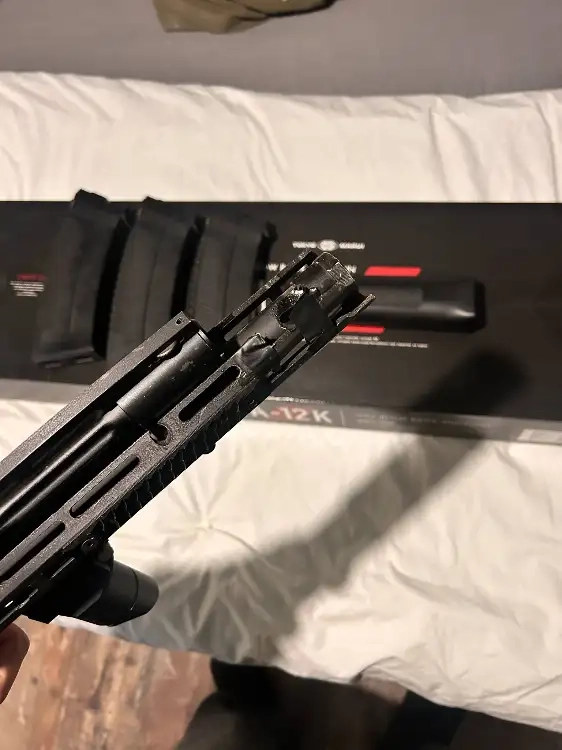 Garde main, poignées fait en impression 3D, le garde main est abîmer sur lavant ( voir photo ) forcément c’est de la 3D donc pas résistant, la poignée RAS. Garde main avant d’origine fournis, réplique passer en canon court donc canon d’origine fournis également