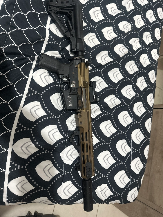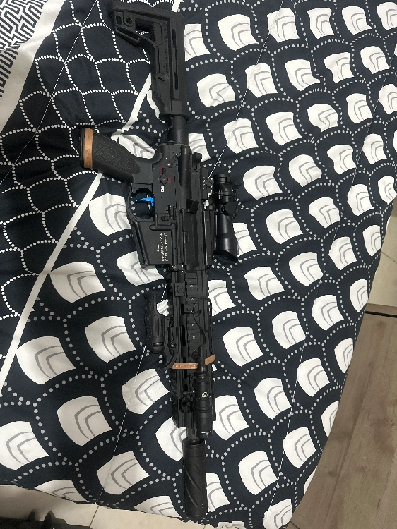 - ensuite, concernant la M4, avec une base de specna arms un petite upgrade a été effectué dessus avec engrenages, renforcé, Gearbox, renforcé, un titan non Bluetooth, celle-ci sera vendue avec un viseur réflexe, silencieux, une poignée inclinée, quatre chargeurs, deux batteries et une housse de transport souple ainsi que un ressort 120 pour que la réplique soit à 1,2 J. Actuellement elle dispose d’un 90 pour être en dessous des 1J