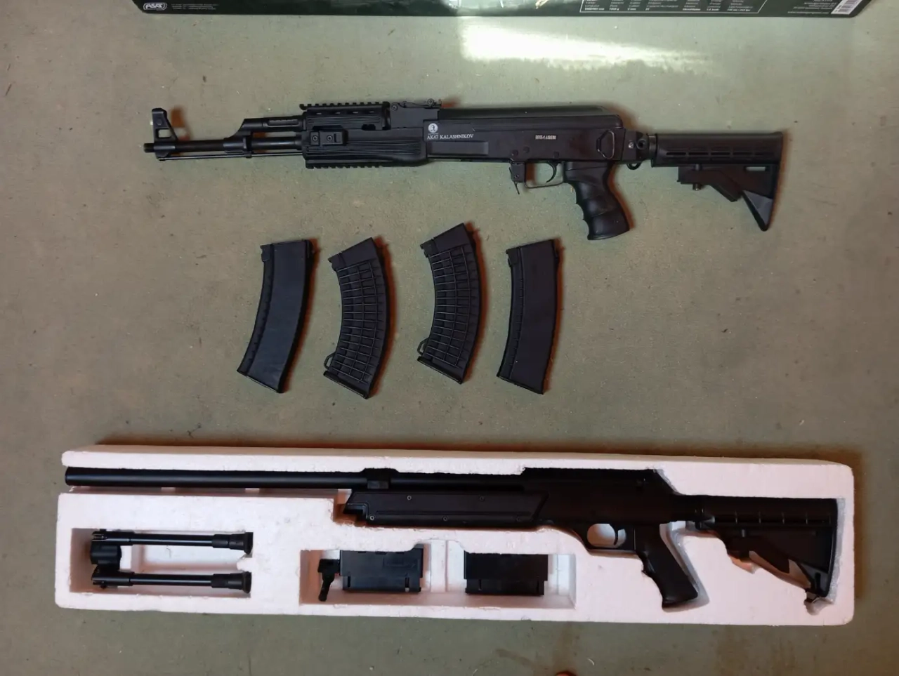 AK (5 chargeur hi-cap, oui 4 sur la photo mais j'en ai retrouvé un supplémentaire) : fonctionne mais bourre quand le hop up est serré au delà du quart + billes imprécises dès 15m quand le hop up est au minimum