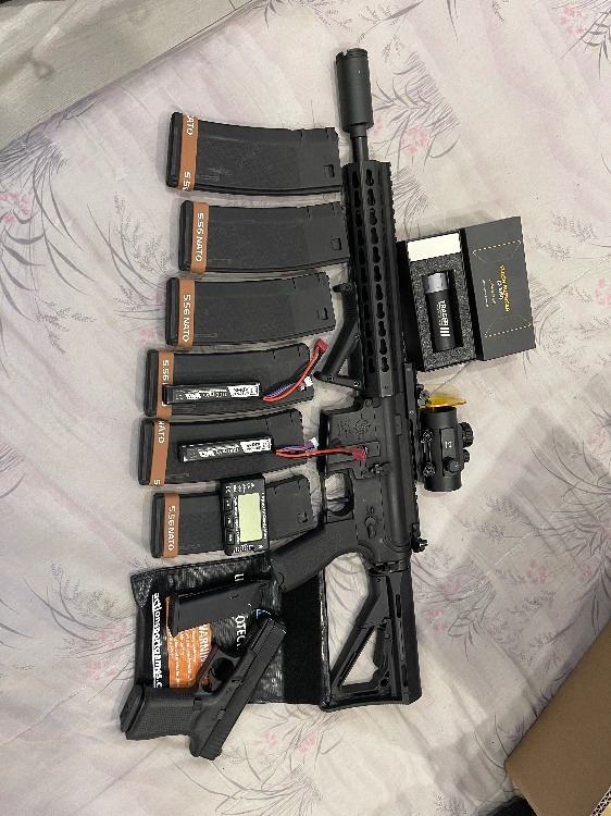 Je vends le lot donc un M4 plus ces chargeurs mid cap donc 6 et 2 batterie lipo avec pochette et pour voir la charge de la batterie et il y’a le ressort M120 et j’ai le ressort d’origine si vous voulais j’ai les billes bio 0.28g et 5 bouteilles de gaz