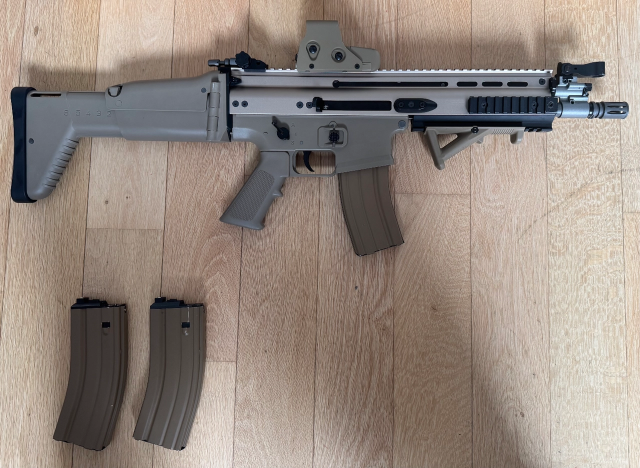 L’airsoft est en très bon état, il a toujours été bien entretenu, je l’ai nettoyé à chaque utilisation, il marche parfaitement. Il est livré avec deux chargeur à gaz, un chargeur au CO2, deux bouteilles de gaz, un viseur reflex à point rouge, une poignée, des billes biodégradables, des supports de cible en métal et des cibles en carton.
