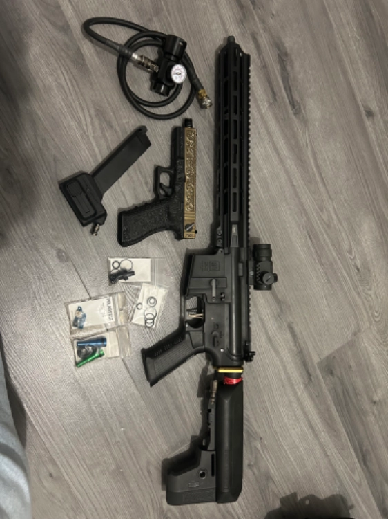 4 chargeur mis cap pas sur la photo compris avec un silencieux pts tan, 2 bouteilles 0.8l est régulateur avec flexibles aussi
