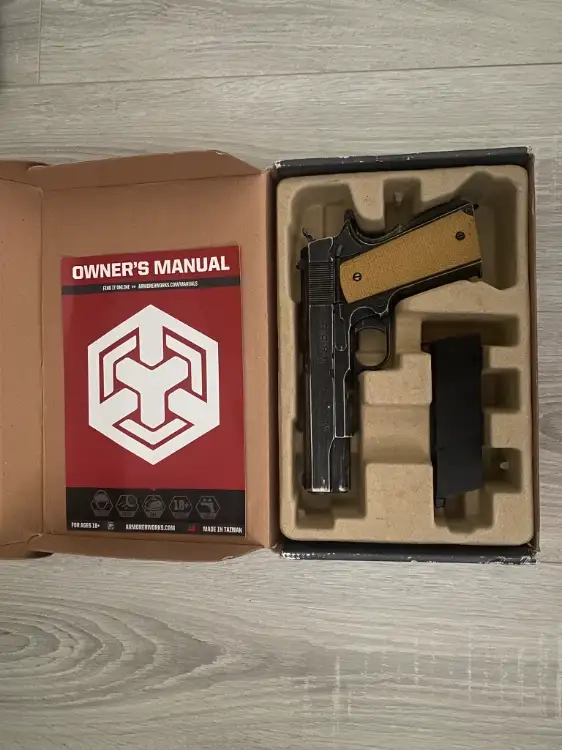 Il est vendu dans sa boîte d'origine avec 2 chargeurs, celui d'origine (effet usé) & un autre racheté à côté (noir), et un holster.