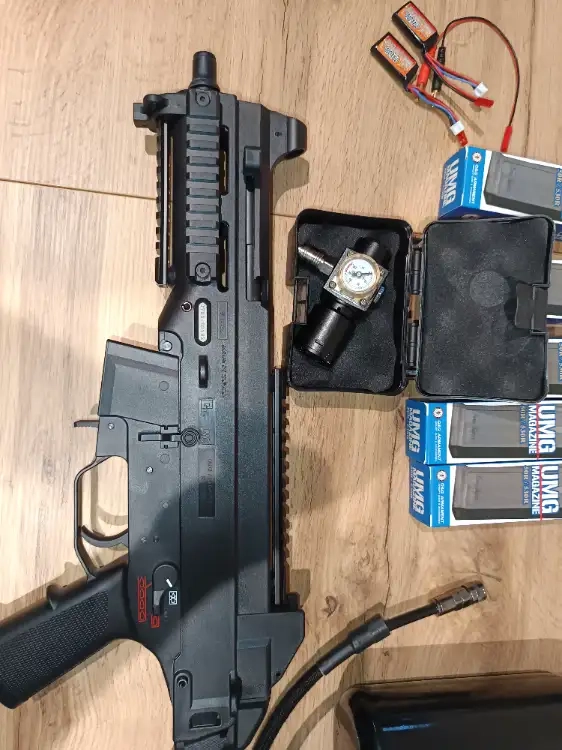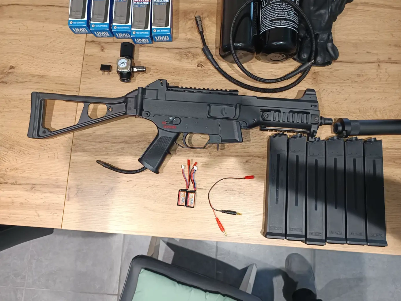 Nous avons donc: un UMG g&g monté en polarstar F2, fourni avec : cinq chargeurs 50 coups + son hi cap d'origine, deux bouteilles HPA récentes (reste 7 ans à l'une 8 ans à l'autre) en alu sans fuites, avec bouchons de protections, joints supplémentaires, un régulateur balystik allant jusquà 160 PSI, flexible US, deux batteries HPA, le câble de recharge dédié, le silencieux spécifique umg g&g, la saccoche valken pour la bouteille hpa (se fixe sur passants molle) le tout fonctionnant nickel, une vidéo sera possible, des photos supplémentaires également, l'entretien de la gb a été fait par un pro suite à un montage y'a quelques mois, fonctionne nickel.