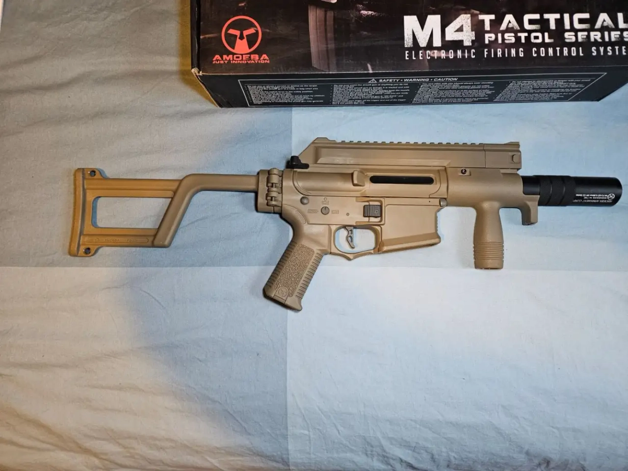 Vendu avec 4 chargeurs mid-cap Amoeba, dont 2 légèrement modifiés pour être compatible avec d'autres répliques.