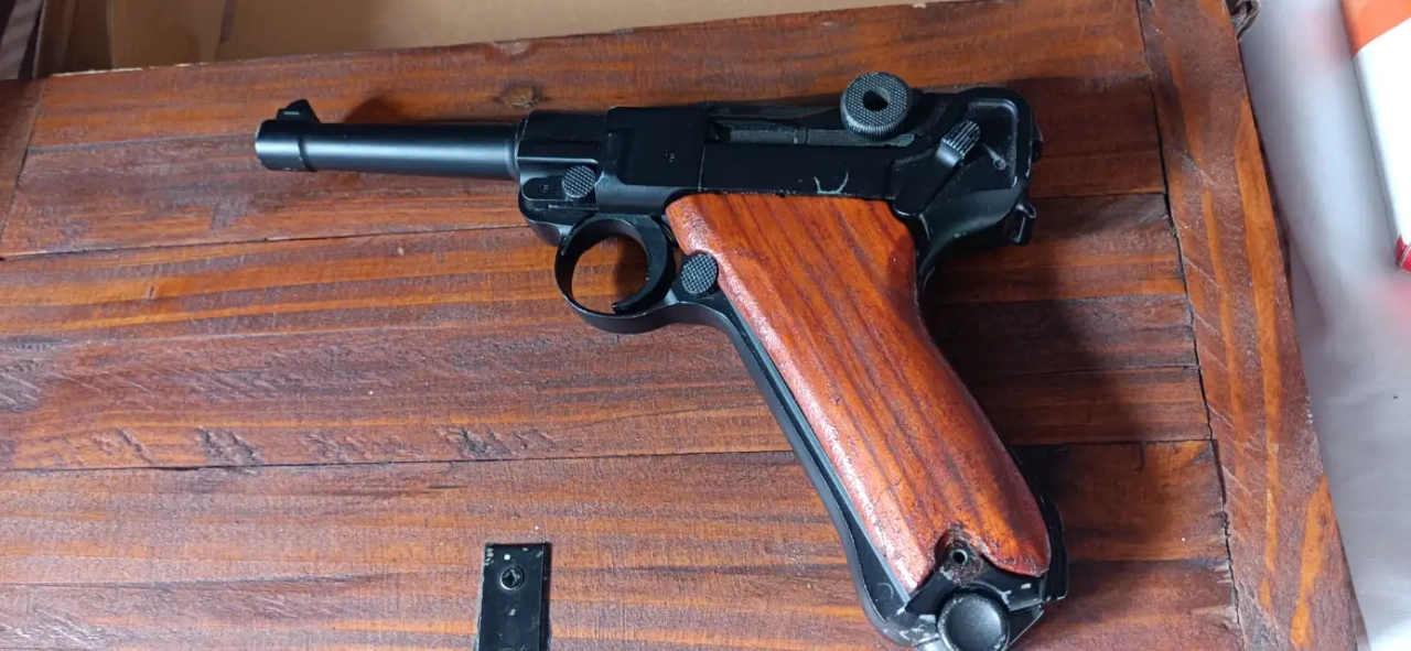 Paire de poignée en vrai bois réel pour réplique d'airsoft Luger P08 de chez We-Tech, certainement compatible avec celles de KWC