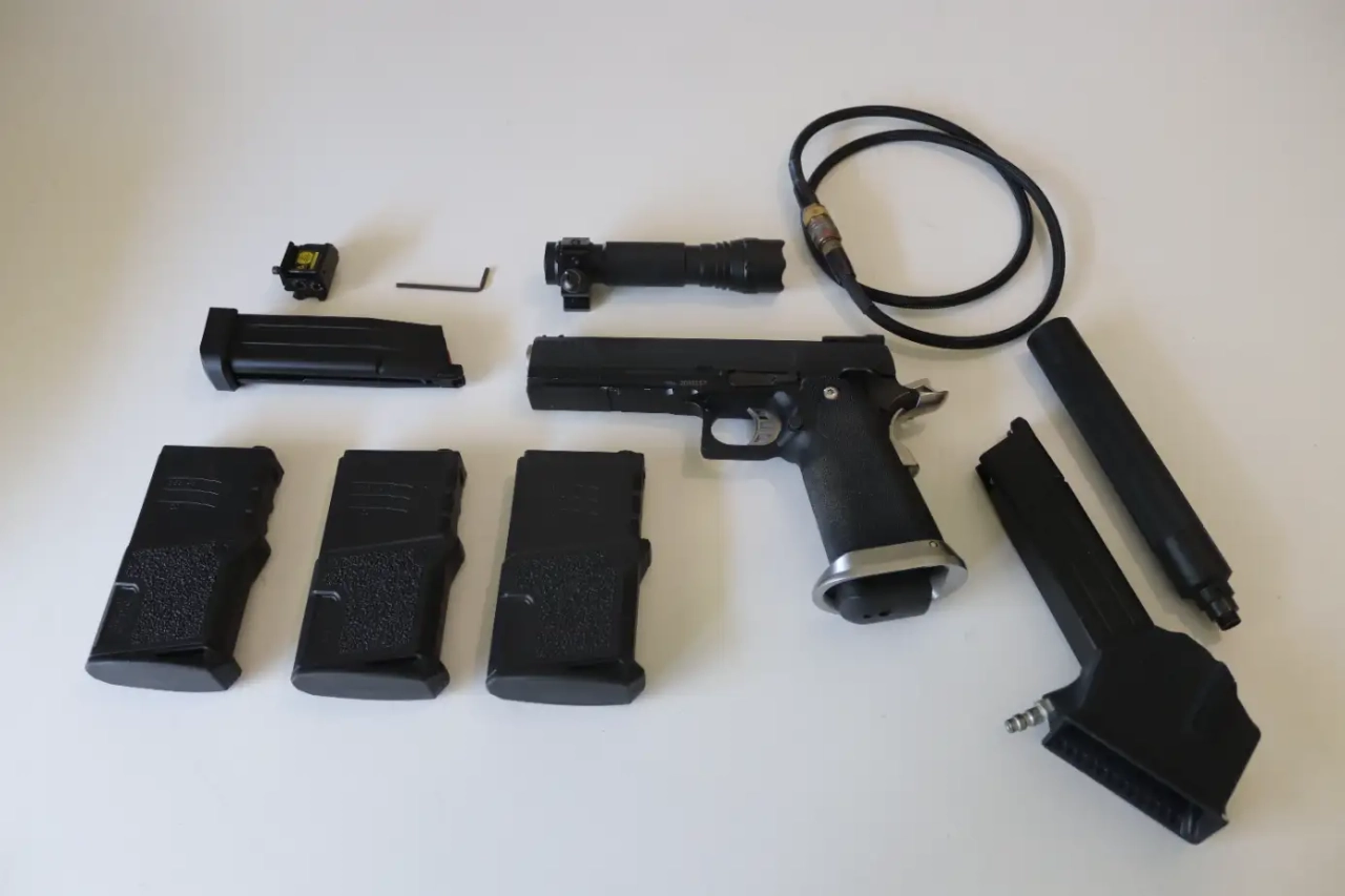 Accessoires inclus : Caisse de rangement, 3 chargeur Mid cap 120 billes, adaptateur Monk, laser, 2 chargeurs a gaz, lampe et un silencieux