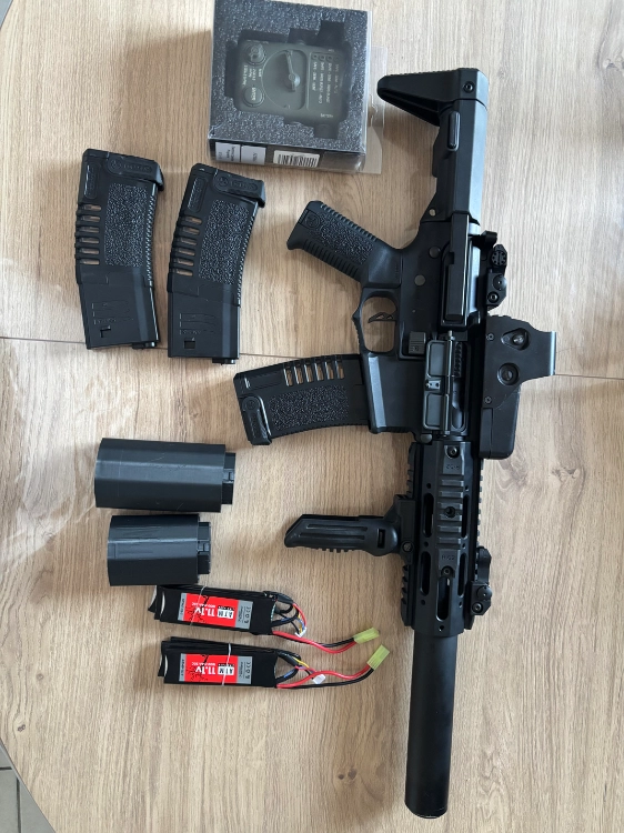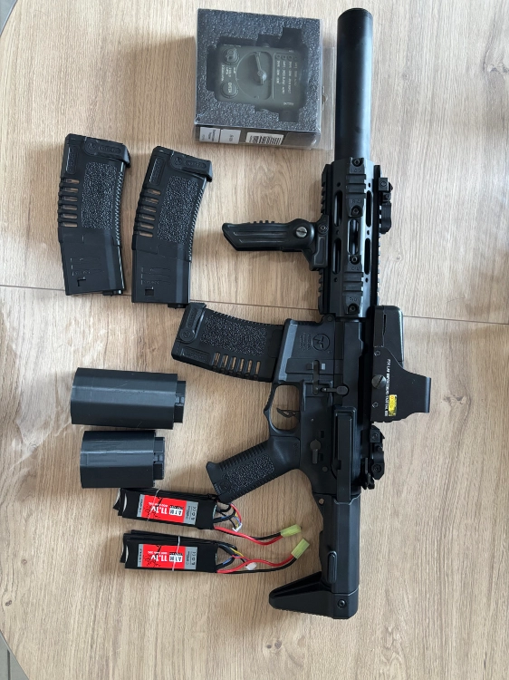 Je met en vente cette Arès Amoeba AM014, équipée avec viseur Eotech (Repro mais fonctionnel), une poignée droite pliable, 3 chargeur Arès PGM 140b, 2 batterie 11.1V 1800mAh ATM (mini tamiya), 2 rallonge de crosse afin d’y loger les batterie 11.1V ainsi que le boîtier de programmation Amoeba.