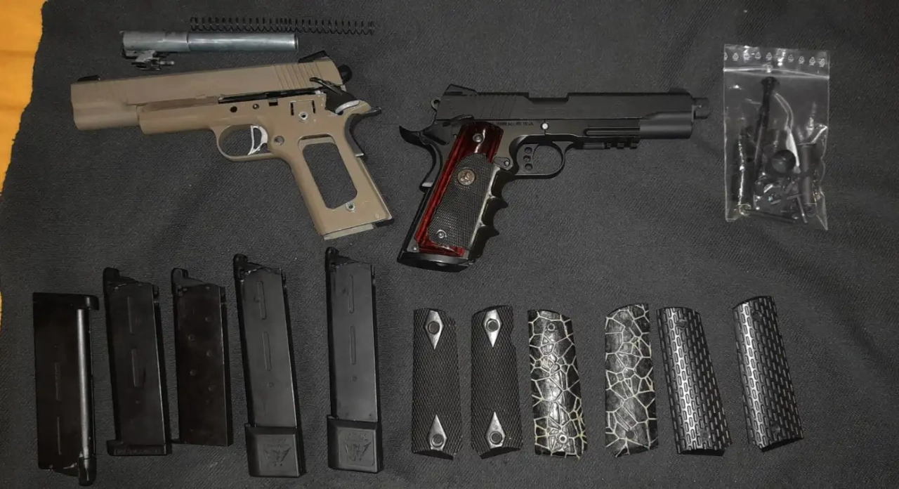 Il s'agit de la fusion de 2 Colt 1911 Army avec des pièces Guarder comme la culasse alu et les mires acier.