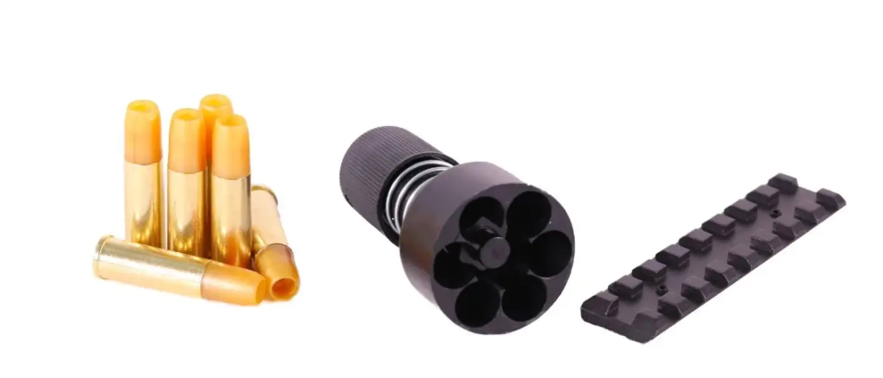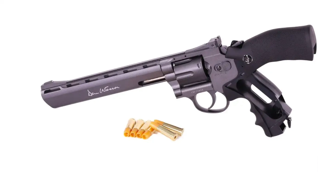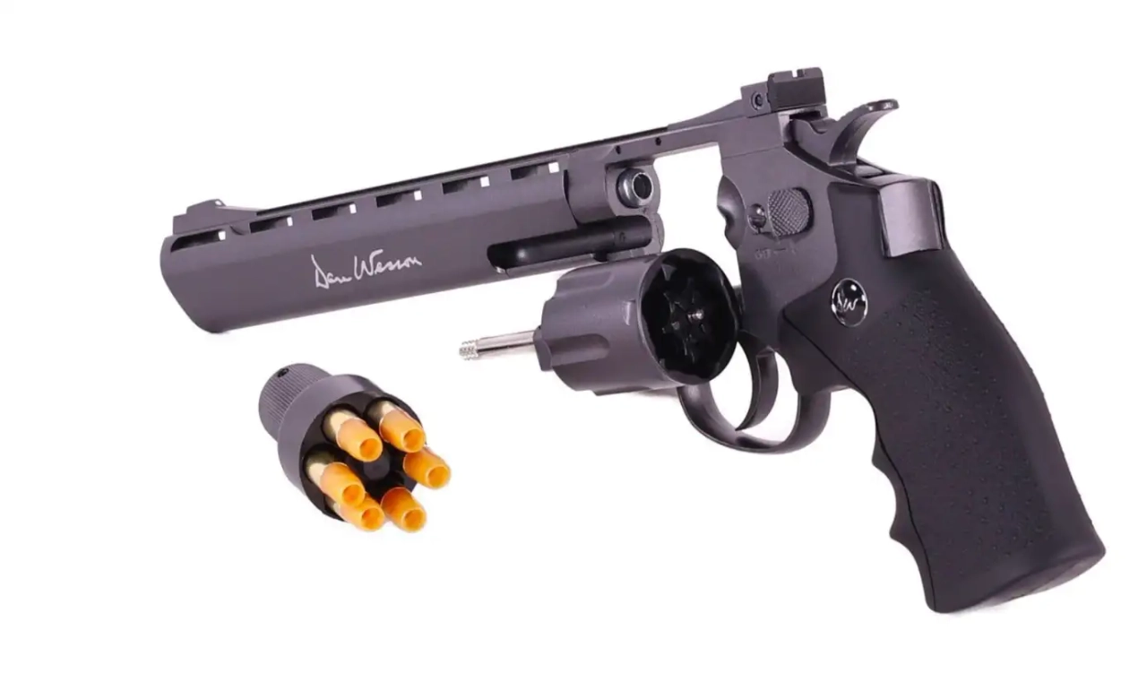 Réplique de revolver Dan Wesson par ASG. Modèle full métal avec canon de 8" fonctionnant avec une sparklette de CO2 avec son speedloader et un petit rail.
