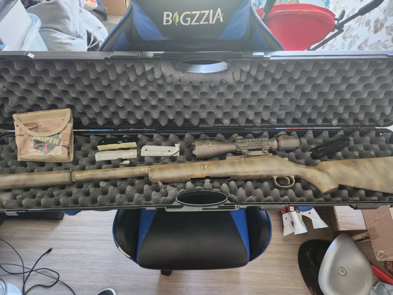 Bonjour, je vends mon VSR10 modifier avec d'autre choses car j'arrête lairsoft manque de temps. Il est en paraît état, utiliser en combat et sans aucun problème. Peinture faite dessus et 4 chargeurs avec lui, sa valise de transport et un sac pour les chargeurs +BB