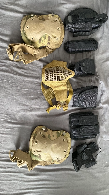 Comprend : 1 paire de genouillères camo, 1 grille de protection faciale, plusieurs pochettes tactiques (chargeurs, radio, etc.).
