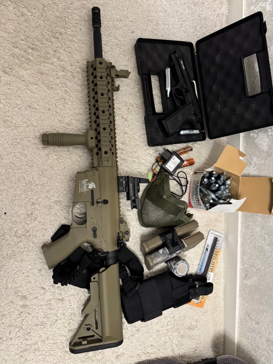 Avec tout ça je laisse également un paquet de 4000billes 0,25, protection à grille, étui pour le gun, ruban camouflage.