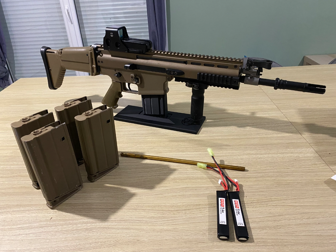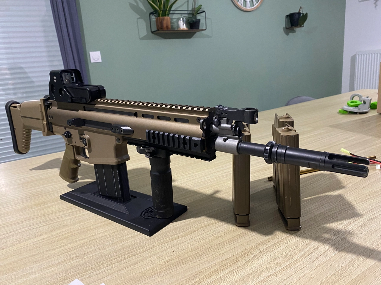 Il y a 4 chargeurs d’origine , le viseur et la poignées alu avec et un support impression 3D pour exposer la réplique.