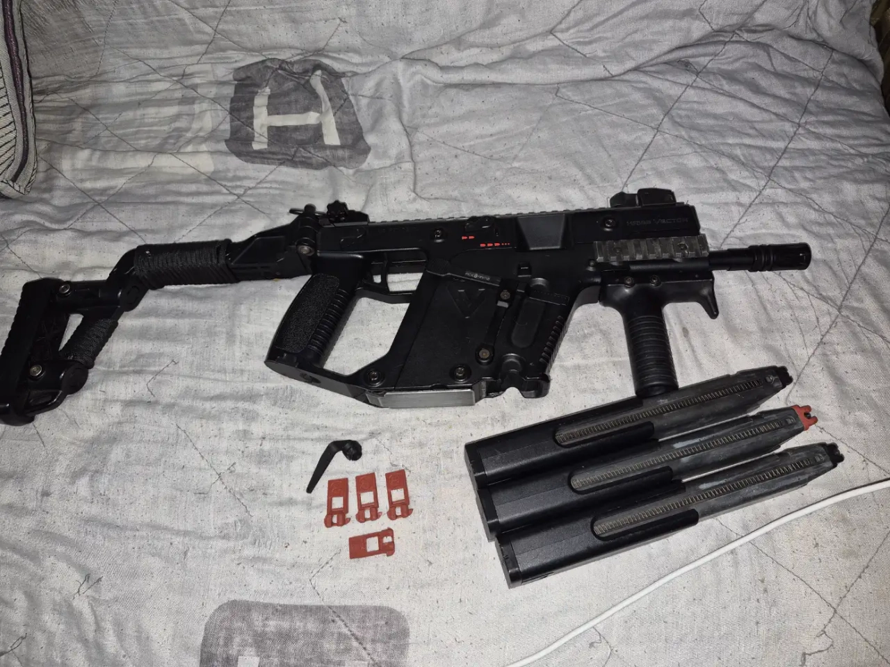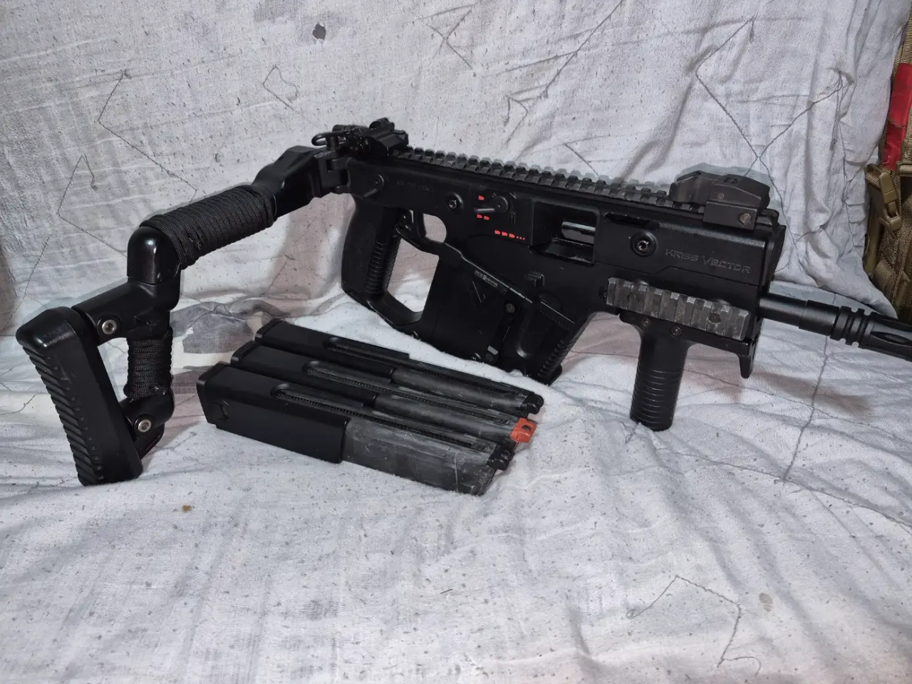 Bonjour, je vends mon Kriss Vector de chez KWA GBBR. Poignée intégrée, paracorde sur la crosse pour le style. C'est une réplique entretenue, les organes de visée sont d'origine. Le coup par coup, le burst de 2 et la rafale fonctionnent très bien.