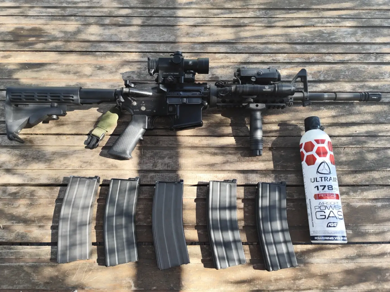 Vend GHK M4A1 full up, canon AAC 6.01, joint MAPPLE LEAF, bloc hop up T.N.T, nozzle RATECH avec Npas, buffer avec ressort SAMOON + tout les accesoires, red dot avec laser point rouge intégré, boîtier peq lampe+ laser rouge, lampe surfire + interrupteur déporté pour la lampe et le boîtier peq, poignée et 5 chargeur GHK.