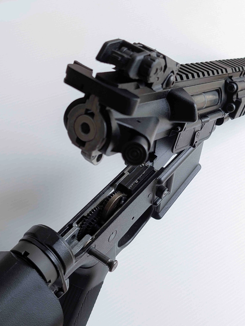 La gearbox inférieure intègre une unité de contrôle électronique ASCU et peut être réglée pour arrêter le tir lorsque les chargeurs sont vides (culasse fonctionnelle).