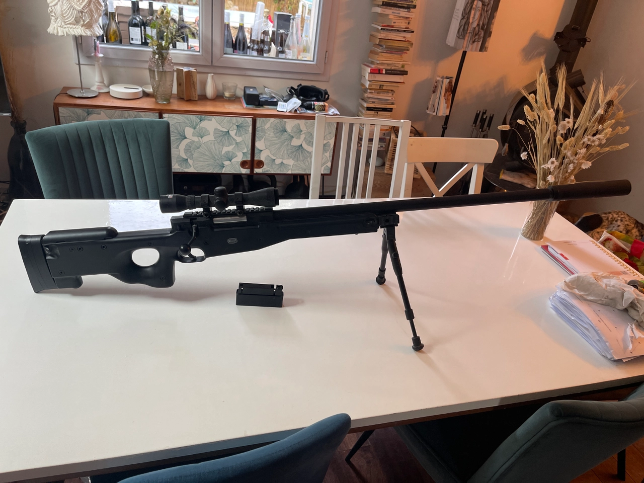 La réplique comprend toutes ses pièces d’origine. Il manque un bout ESTHÉTIQUE à la lunette, tout fonctionne. C’est une réplique à taille réelle. Elle mesure 132cm de long.