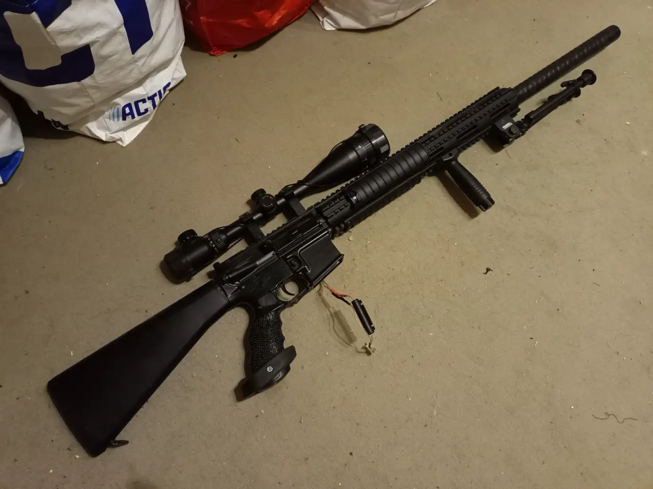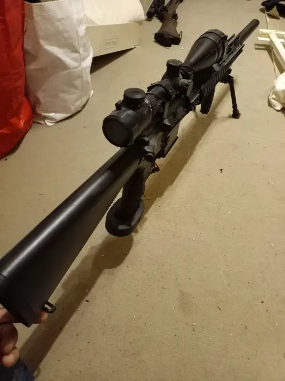Je met ce M4 antisnipe ( origine blowback ) mais neutralisé car le blowback déconnais plus qu'il ne fonctionnait. Vendu avec un chargeur lowcap, crosse type m15, lunette rétro-éclairé, cannon en carbon, recouvert de guidoline pour éviter les coups. De base cette réplique possédait un Anpeq pour la batterie mais ce dernier a était vendu il y a bien longtemps. Donc le fil et la résistance sort toujours pas le coté mais peuvent repasser dans la crosse. La gearbox a besoin d'une petite coup de neuf je pense ( échange de joint et graissage) testé sur l'alimentation stabiliser elle tourne bien.