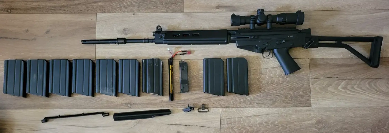 - Fal Para (crosse pliante) full lenght (canon long) de la marque King Arms, valeur d\'achat à neuf à l\'époque 450€, aujourd\'hui introuvable. La carcasse est entièrement en métal, réplique de très belle qualité, robuste, et que l\'on ne croise jamais en partie.
