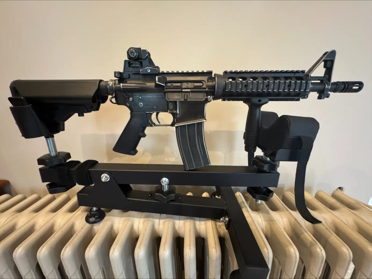 La réplique a été fabriquée en utilisant, entre autres, de l'acier, de l'aluminium et du plastique. L'anneau de sangle tactique, toutes les goupilles et les vis sont en acier . L'aluminium est utilisé pour les éléments suivants : amortisseur de flammes, canon externe, rails RIS sur le lit, anneau delta, canon, grip de rechargement, volet d'éjection d'obus, crosse, anneau de montage de la flasque avec son guide. La grip de pistolet A2 caractéristique et la gourde sont en plastique.