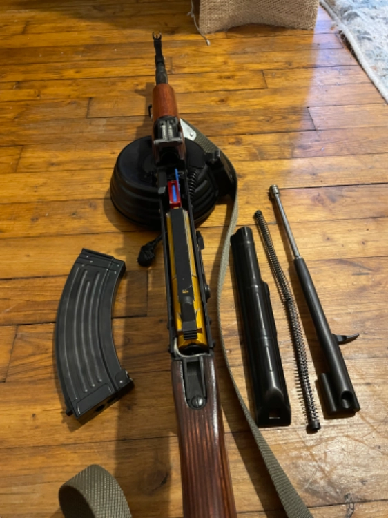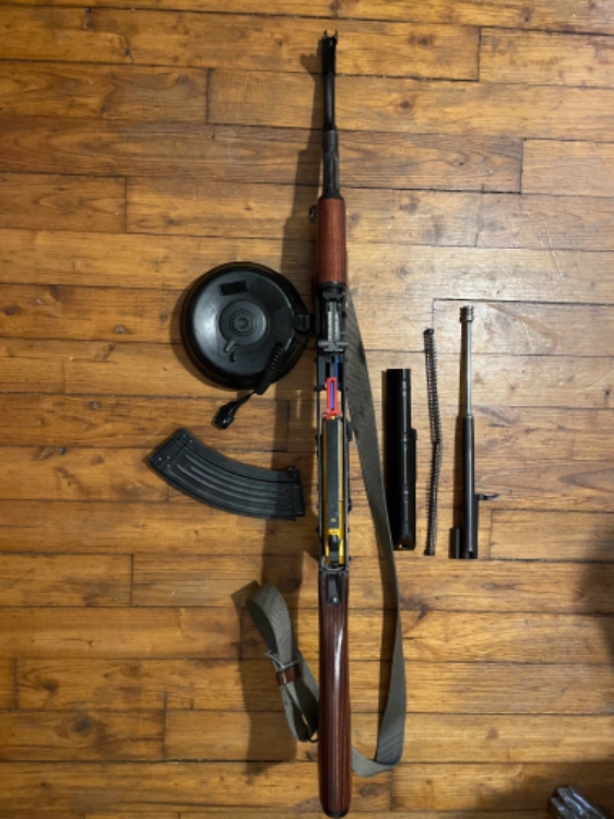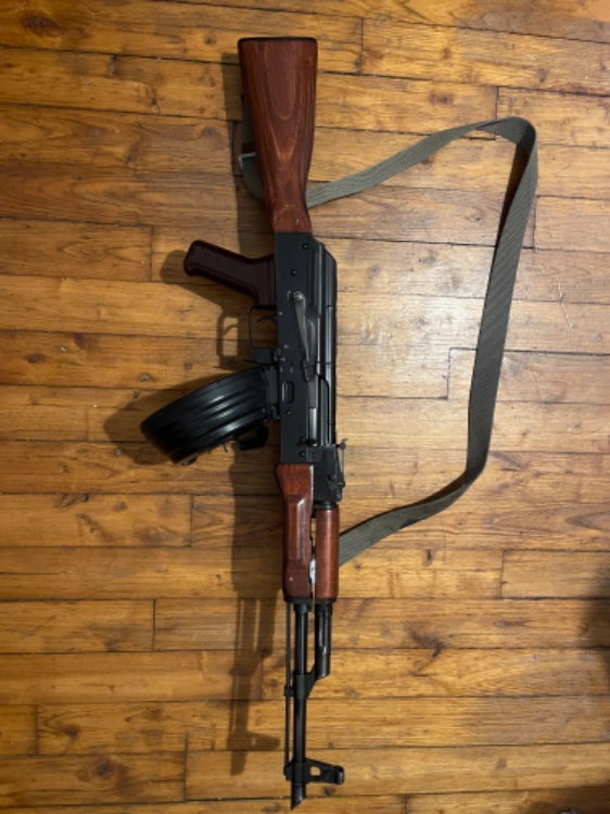 Fourni avec un chargeur E&L acier et drum cyma en acier modifié avec un bouton poussoir deporté et réplique équipée d’une véritable sangle d’époque.