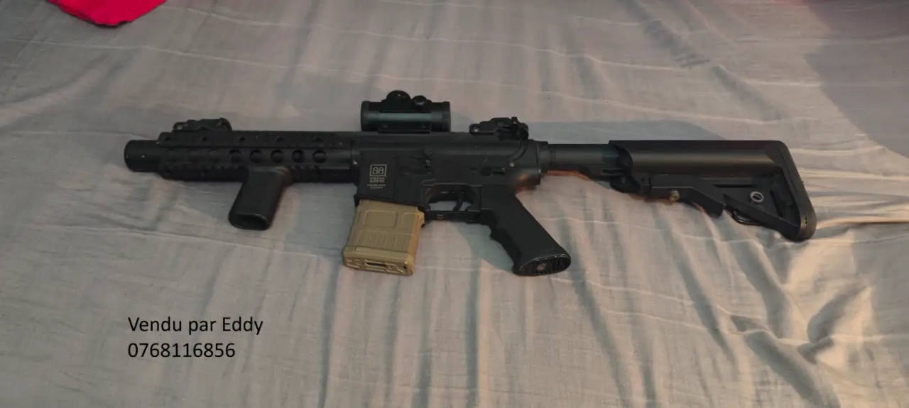 Je met en vente une replique de m4. Elle a a son actif 4 parties. Je n'ai plus le temps de pratiquer. Je la vend avec un chargeur mid cap (120 billes), 2 chargeurs low cap (30 billes), la boite d'origine, un viseur optique. Possibilite de rajouter des batteries.