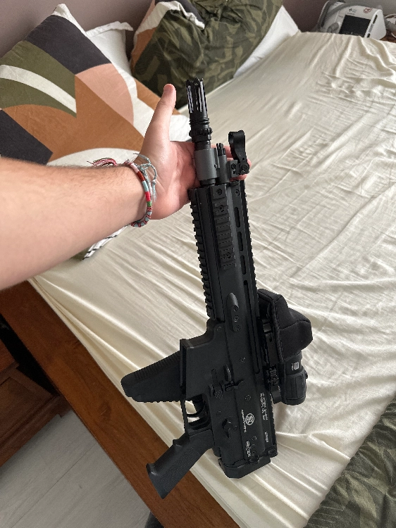 Scar-L cybergun /Super état fourni avec deux chargeur 250 billes a roulette , la crosse de la réplique a un soucis et se déplie toute seul ,prix d’une crosse pour changement une dizaine d’euros sur internet seulement ainsi qu’un zoom valeur neuve 260 euros sans accessoires .Je laisse sur la réplique les accessoires qui sont le viseur holographiques ainsi que le zoom rabattable