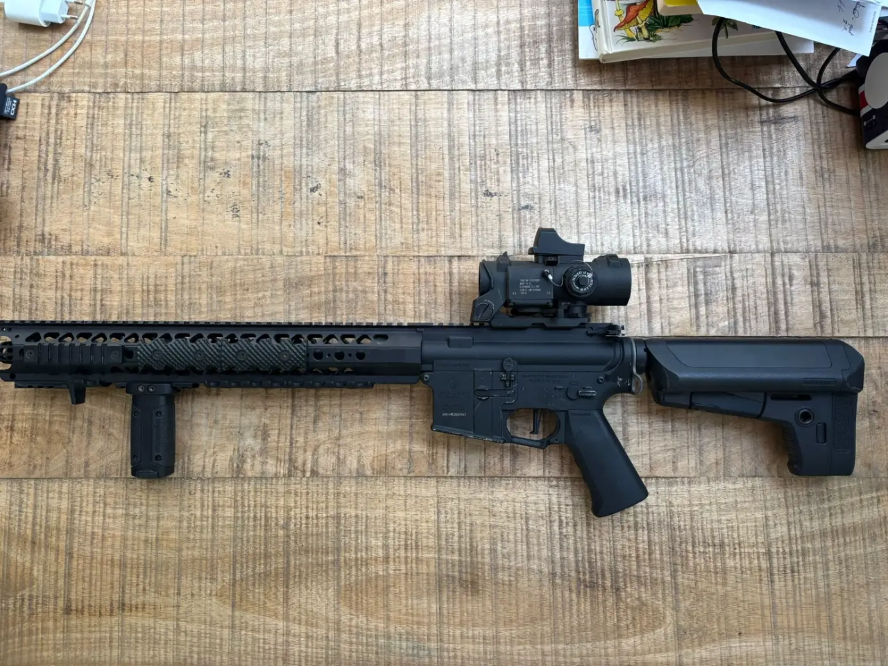 Livré avec un Elcan Specter avec zoom réglable en 1x/4x et sa DMR sur le dessus + ses organes de visée natif (pas visibles sur la photo) + grip de garde main + poignée avant + 2 ajouts latéraux picatinny.