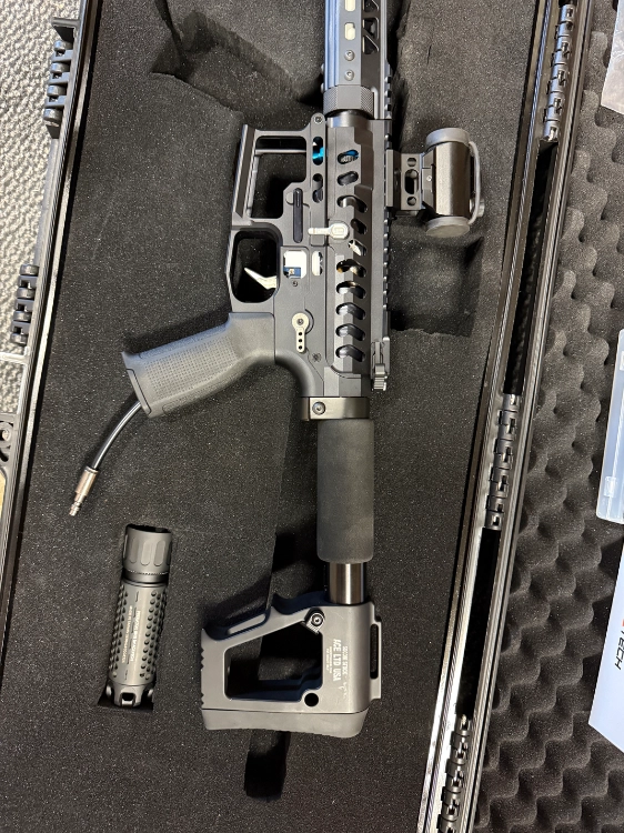 Vends M4 type skeleton, montée de toutes pièces, quasiment toutes les pièces sont de la marque RETROARMS en alu CNC. Monté avec kit hpa polarstar jack. Vendu avec flexible hpa batterie pour FCU,tracer acetech et malette nuprol.