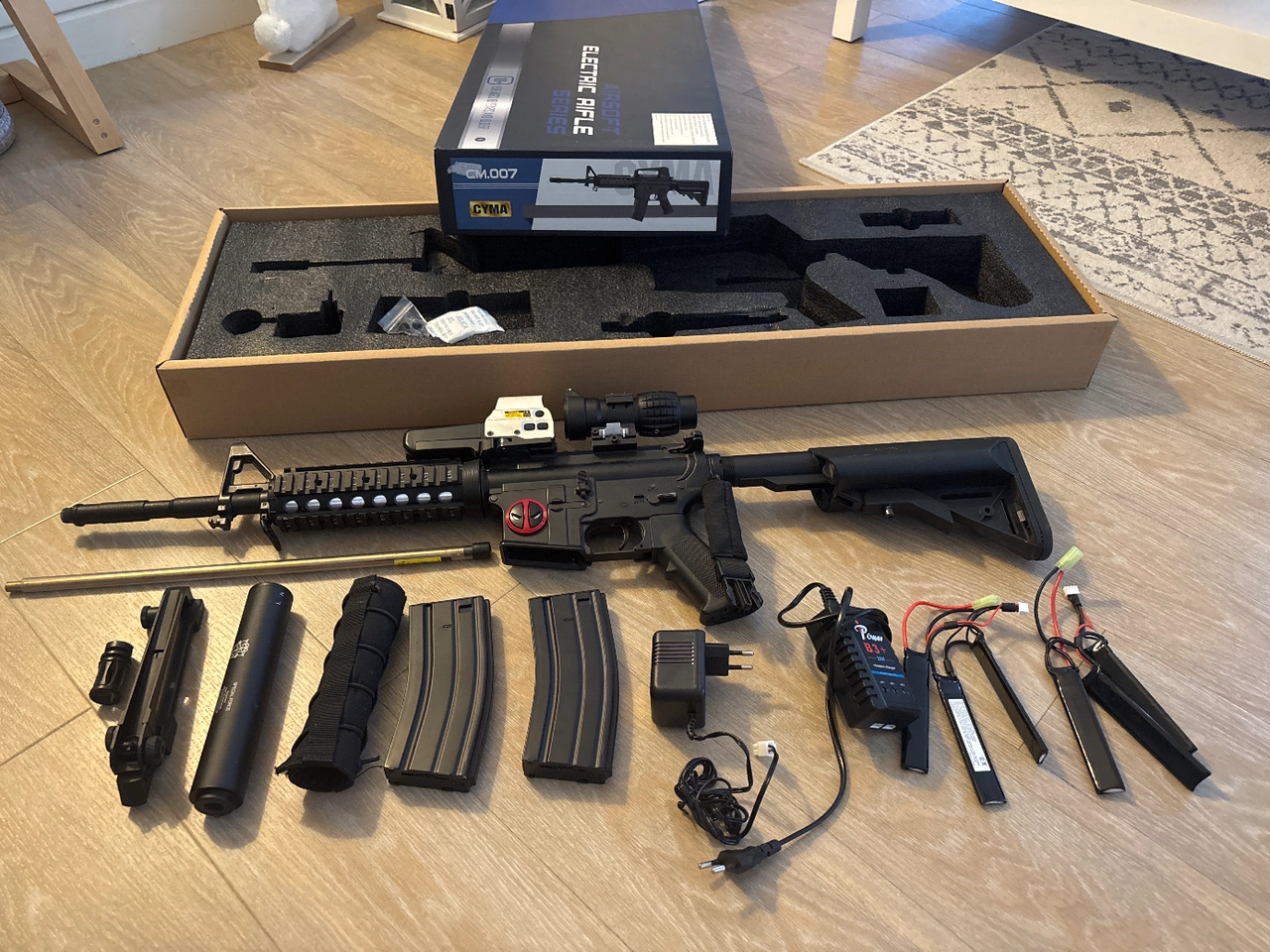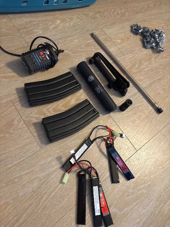 Je vends une réplique d'airsoft CYMA CM.007 (type M4 AEG) en excellent état, complète avec de nombreux accessoires.