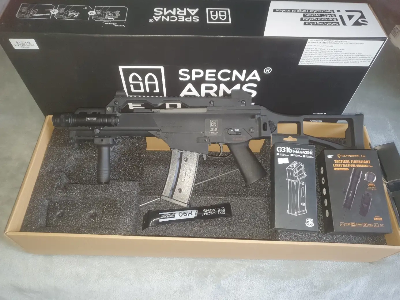 bonjour je vend ma replique g36 specna arms je les utiliser 2 fois elle est equiper d une poignier commando et lampe tactique avec 2 type d allumage de marque skywoods et de 4 chargeurs qui s encoche en double chargeurs