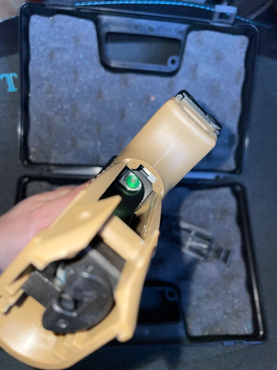 Je pense qu'il faudra simplement graisser la réplique / huile siliconée avant de s'en servir à nouveau. La réplique est vendu avec sa mallette.