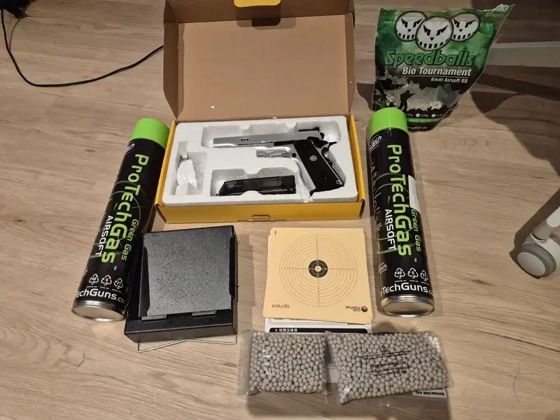 Pistolet 1911 tout métal de 1,2 joules avec 2 bouteilles de gaz, cible, 3000 billes et chargeur rapide