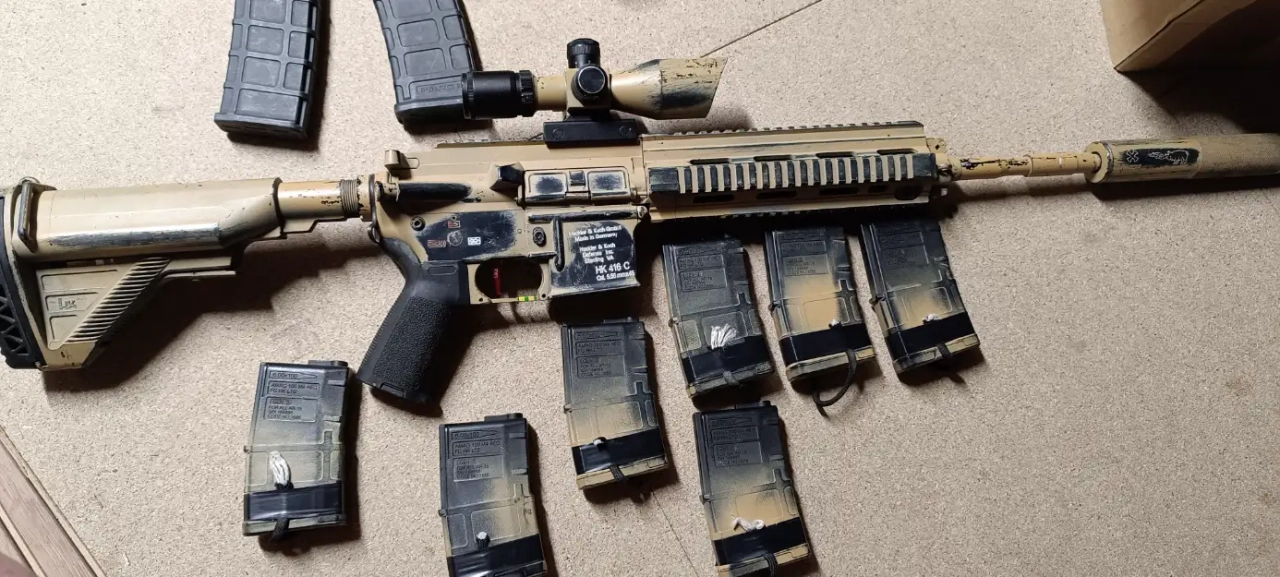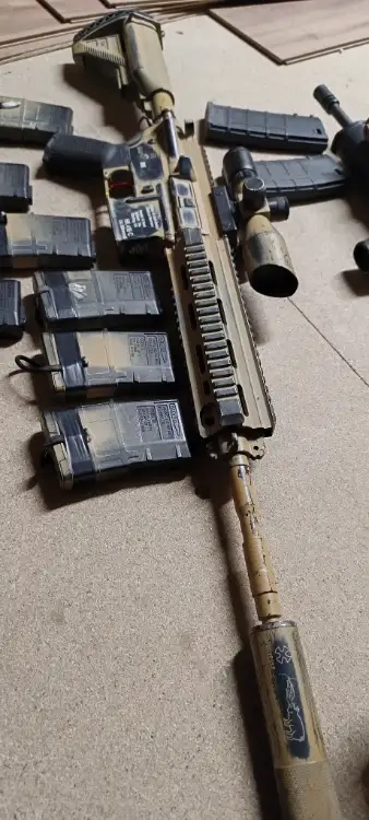 un Hk 416 monté en DMR ( attention replique Lognue ) 102cm, couleur camo desert, full metal, avec :