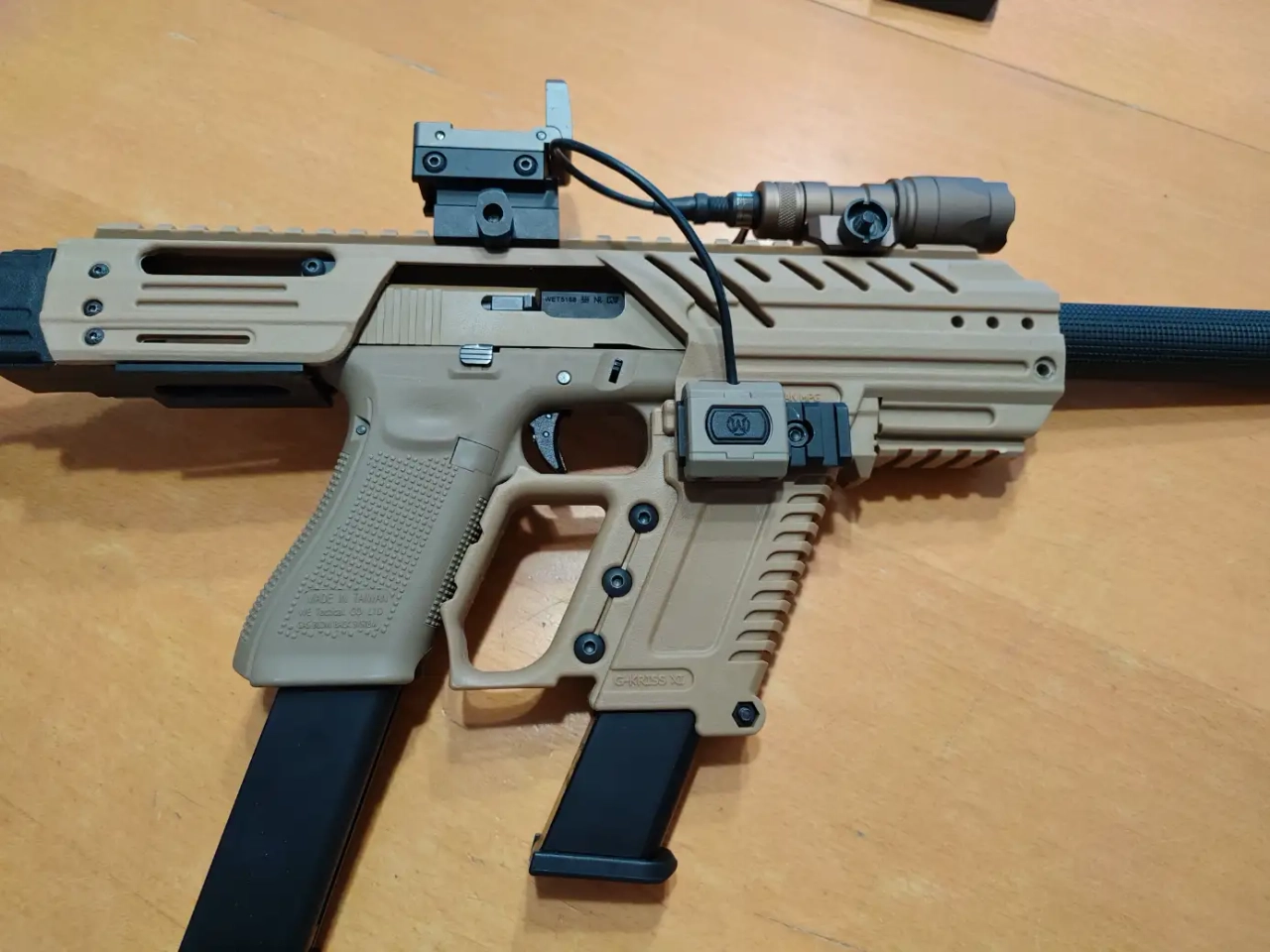 Bonjour je vend cette réplique composée d'un kit Slong PCC Kriss XI Tan , un G17 WE Tan avec un innerbarrel AAC de 186 mm , un red-dot flipable Tan , d'une lampe WADSN X300 Tan avec un switch déporté et d'un silencieux Slong permettant de cacher l'extension de canon