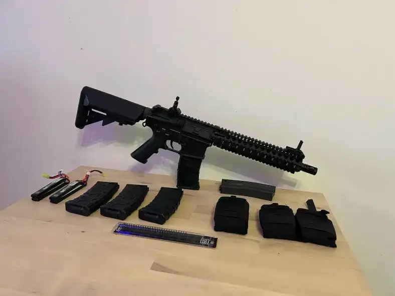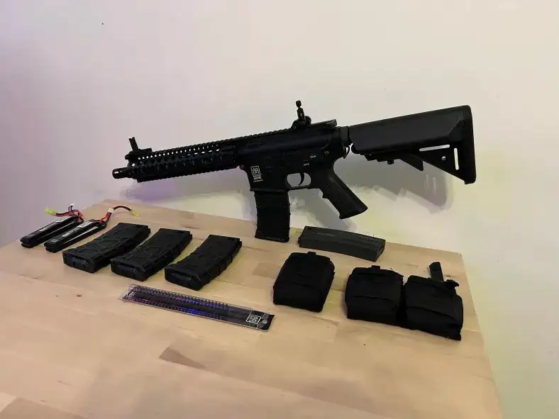 Je l'ai acheté pour débuter puis j'ai fait ma première partie et je suis tombé amoureux de la réplique d'un ami que j'ai achetée en fin de journée pour remplacer la MK18 présente sur l'annonce. La réplique n'a donc servi qu'une journée et présente seulement de très légères rayures. Tout est neuf.