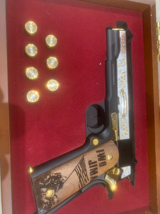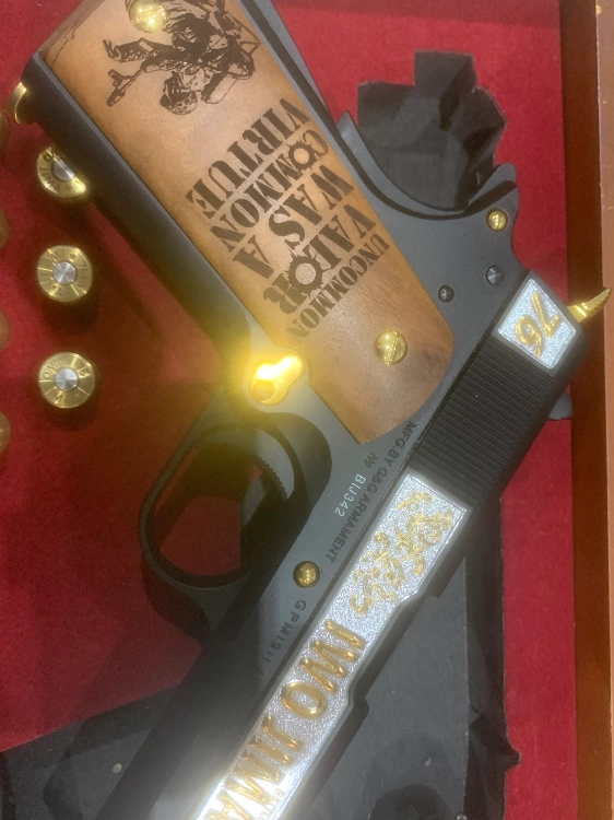 Cette version personnalisée à l'occasion de cette bataille de la Seconde Guerre Mondiale est vendue dans une boite en bois pré-découpée avec 7 cartouches .45 ACP factices.