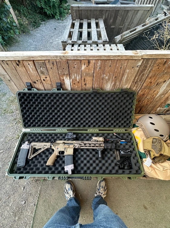 Je fournis avec une sangle pour l’accrocher, 5 chargeurs + un viseur lasers + un holographique + une case de 1 mètre pour la transporte.